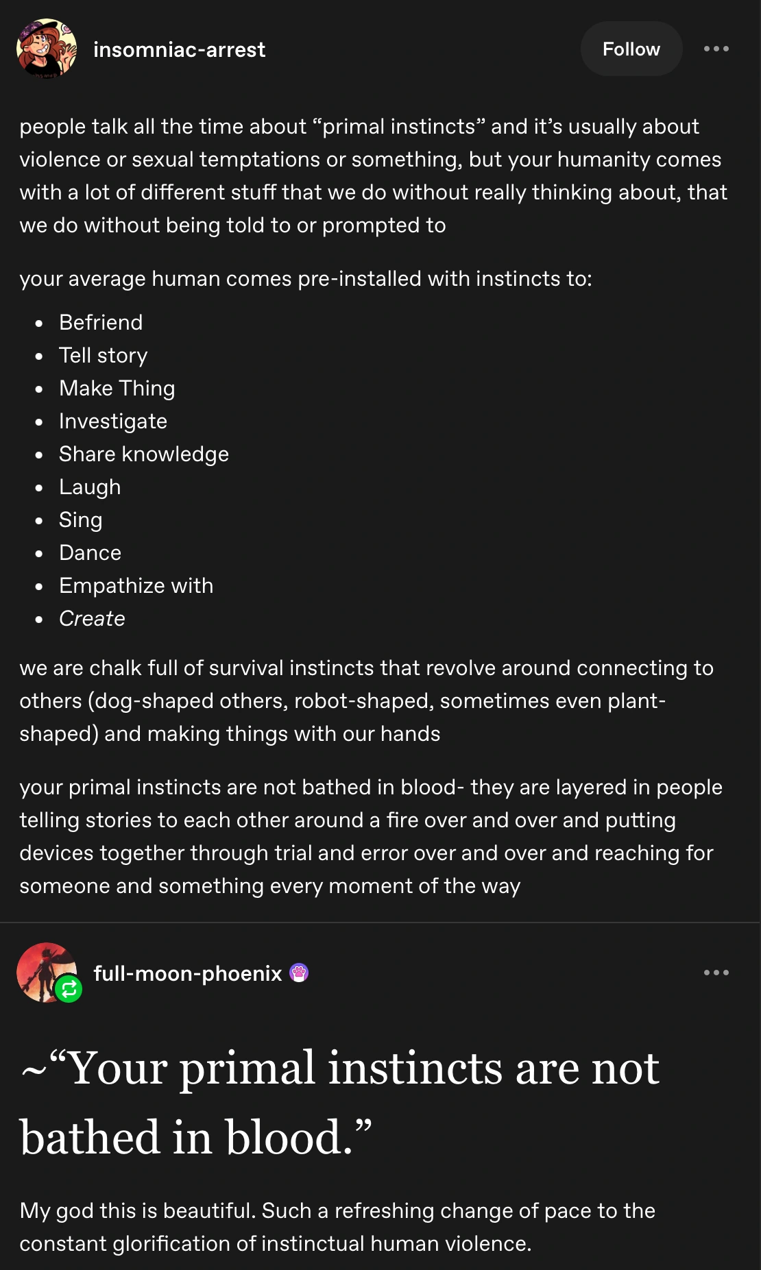 Link: https://www.tumblr.com/thechekhov/677861872807067648/people-talk-all-the-time-about-primal-instincts?source=share